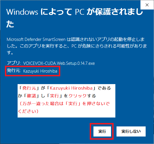 起動しようとすると「Windows によって PC が保護されました」というダイアログが表示されるかもしれません。その際は「詳細情報」をクリックし、発行元が「Kazuyuki Hiroshiba」であることを確認してから「実行」を選んでください。