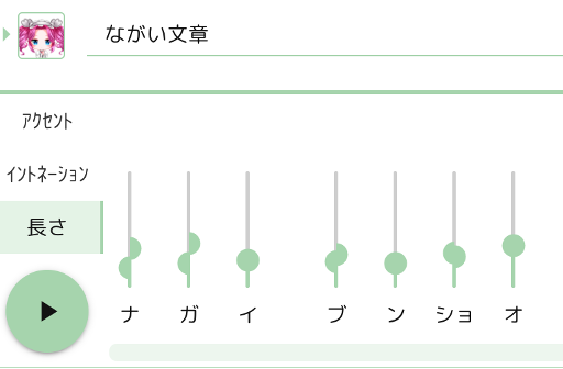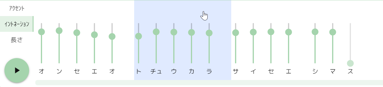 「長さ」をクリックして現れる縦線のバーを上げるとその音を長く、下げると短くできます。 右のバーが母音、左のバーが子音に対応しています。